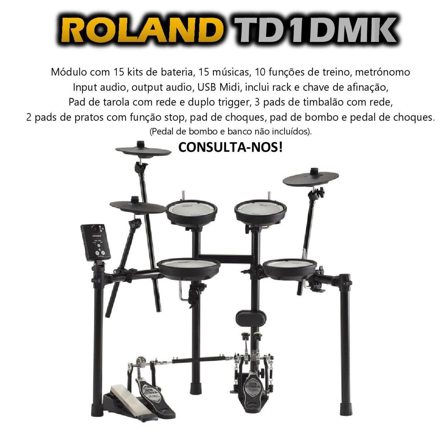 Módulo de 15 Kits de bateria, 15 músicas, 10 funções de treino, metrónomo, input audio, output audio, USB Midi. Inclui Rack e Chave de Afinação. Pad de tarola com rede, e duplo trigger, 3 pads de timbalão com rede, 2 pads de pratos com função stop, pad de choques, pad de bombo e pedal de choques. Pedal de bombo e banco não incluídos.