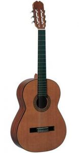 Guitarra Clássica com tampa em Pinho, aros e fundo em Nogueira, braço em Caoba africano, escala e ponte em Pau-Rosa. Acabamento brilhante.