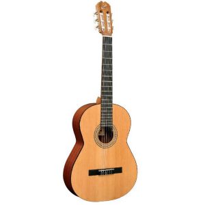 Guitarra Clássica, tampo em pinho Oregón, corpo de Sapelli seleccionado, braço de Caoba africana, escala e ponte em pausanto, contorno de pausanto no tampo e no fundo, carrilhões mecânicos cromados, acabamento brilho.